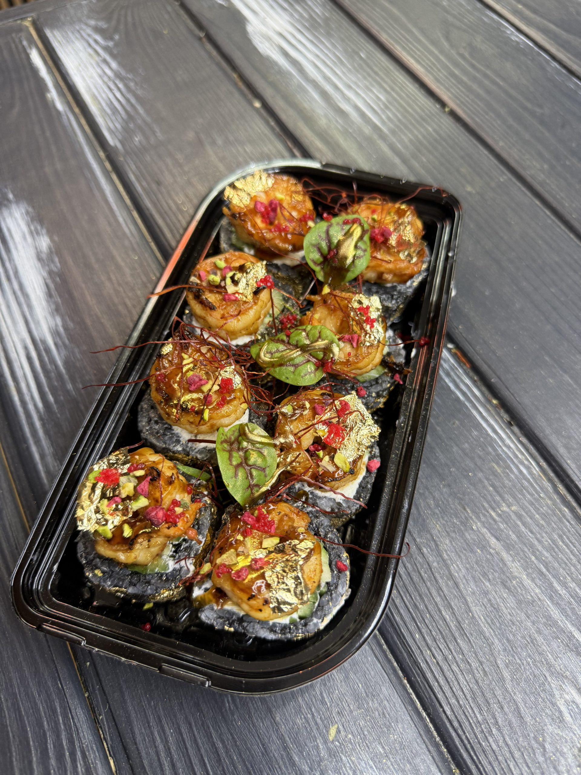Норі, рис, крем сир, чорнила каракатиці, огірок, креветка смажена